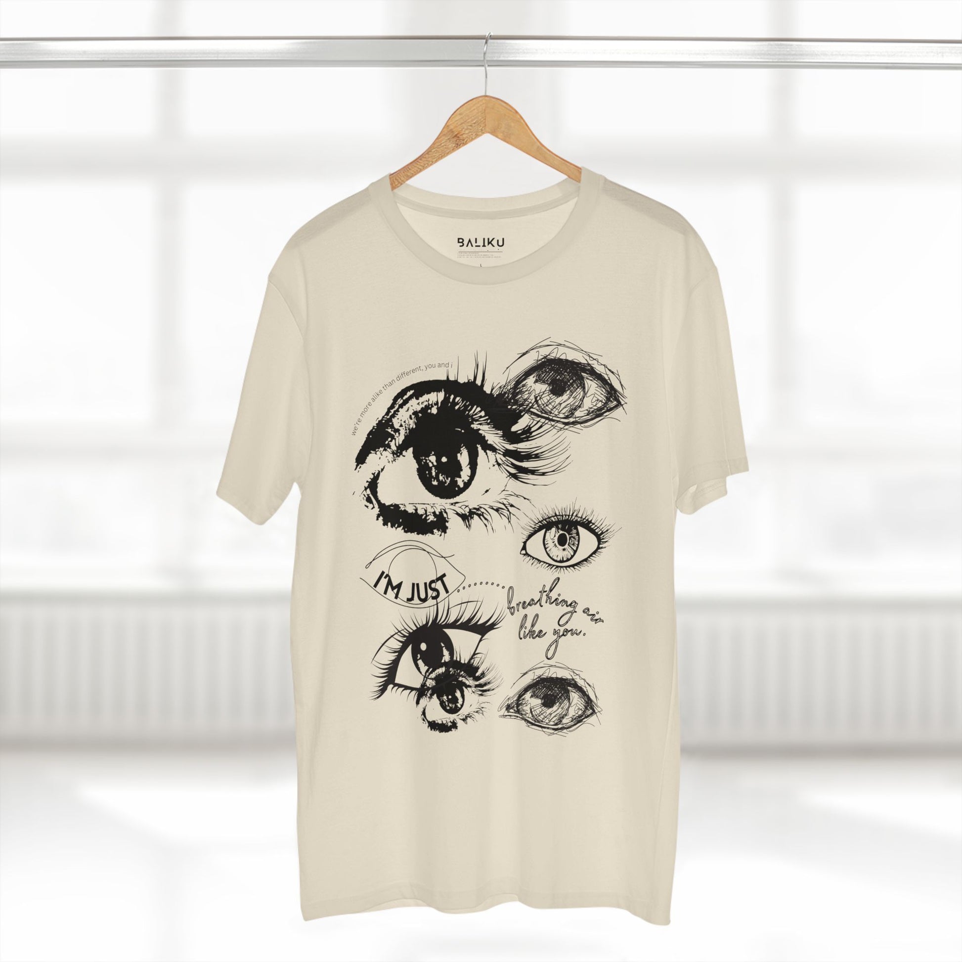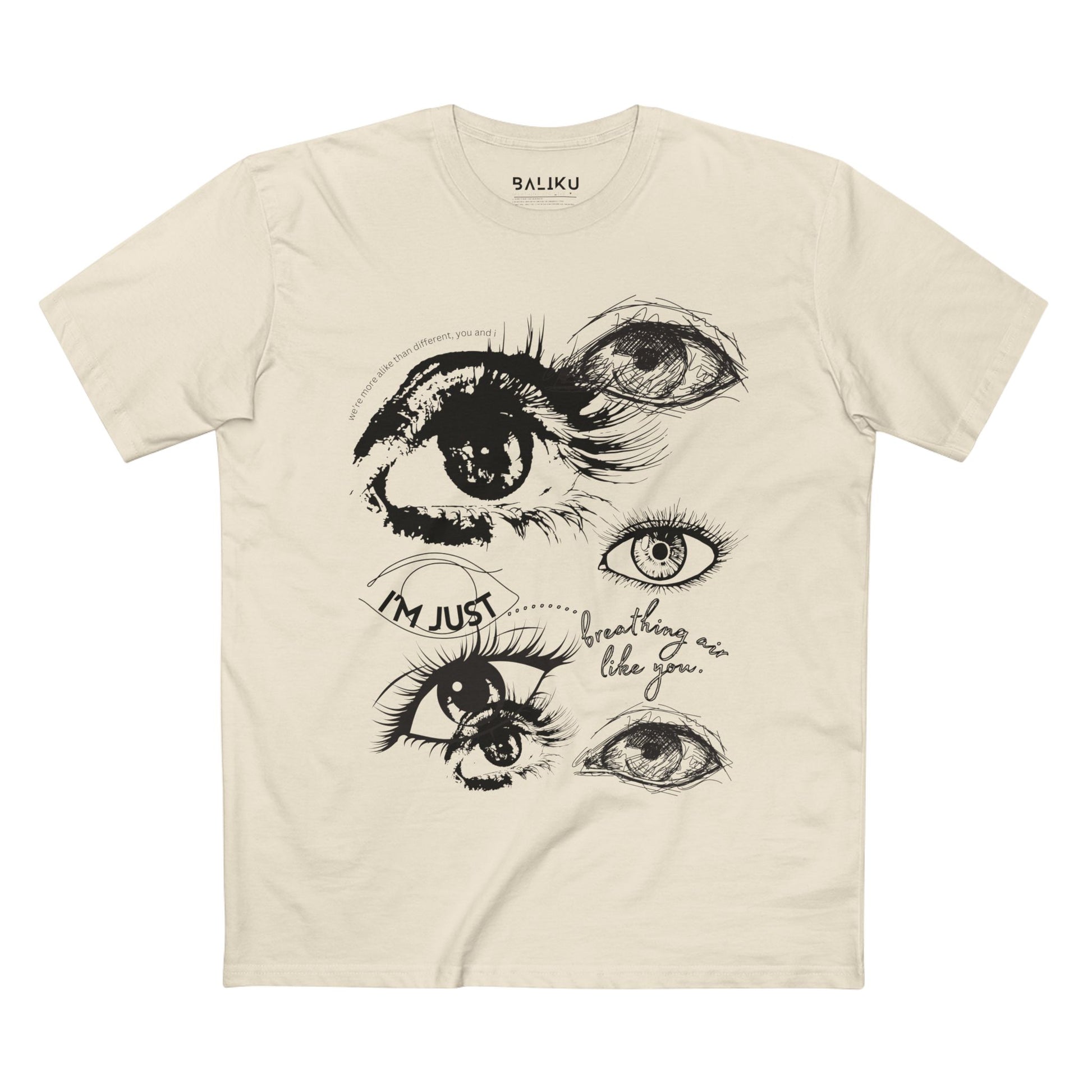 This 100% cotton tee is a simple reminder of something true: we’re more alike than different. Featuring hand-sketched eyes on the front and the words “I’m just breathing air like you,” it speaks to shared humanity without saying too much. Soft, breathable, and made to be worn every day, this tee reflects the heart of the brand—equality, connection, and the idea that beneath everything else, we’re all human. A quiet statement tee for people who believe connection matters.